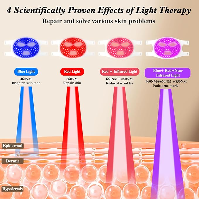 - Red Light Therapy for Face: Red light 660 nm and near-infrared 850 nm are the best combination wavelengths for light therapy. The light can cover the entire skin layer, penetrate the skin deeper than other lights, solve various skin problems, reduce wrinkles, keeping your skin elastic and youthful.
