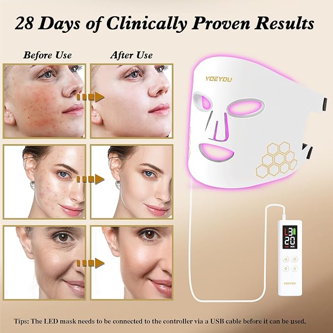- Long Light Wave Combination: YOEYOU LED face mask light therapy uses 4 types of long light waves 450nm-850nm, different wavelengths of light are suitable for different types of skin. Multiple light wave matrices to deeply penetrate skin cells, reshape skin vitality from the inside out, and improve skin condition. 👉The LED mask needs to be connected to the controller via a USB cable before it can be used.👈