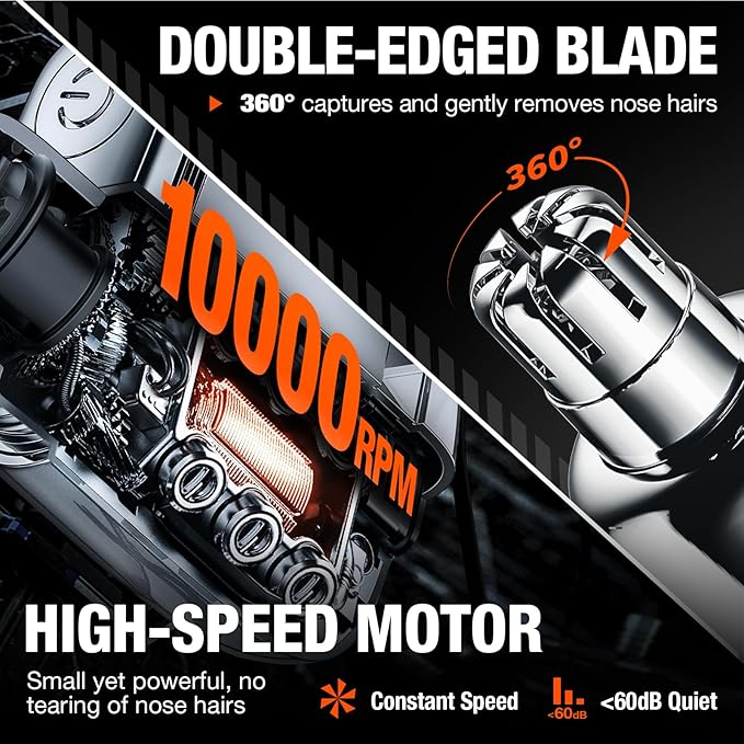 - SMOOTH, GENTLE TRIMMING- 10,000 RPM high-torque motor powers dual-edge blades for clean, crisp trimming. Round, flat cutting head fits inside nose wall. Constant speed motor won't pull nose hairs. Men's Nose Hair Trimmer 360° captures nose hairs and trims them to the proper length to protect nasal health.