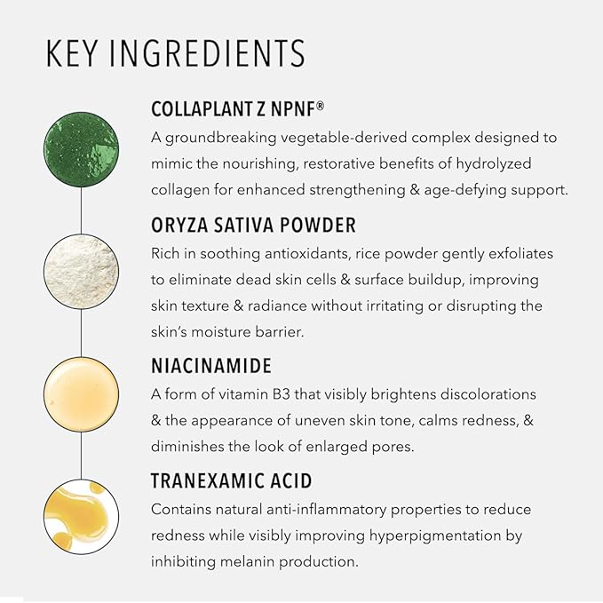 - RESULTS: A potent combination of fortifying peptides, Niacinamide,, Tranexamic Acid, rice powder, and advanced illuminating actives visibly smoothes the skin, revealing a healthy, balanced complexion that glows