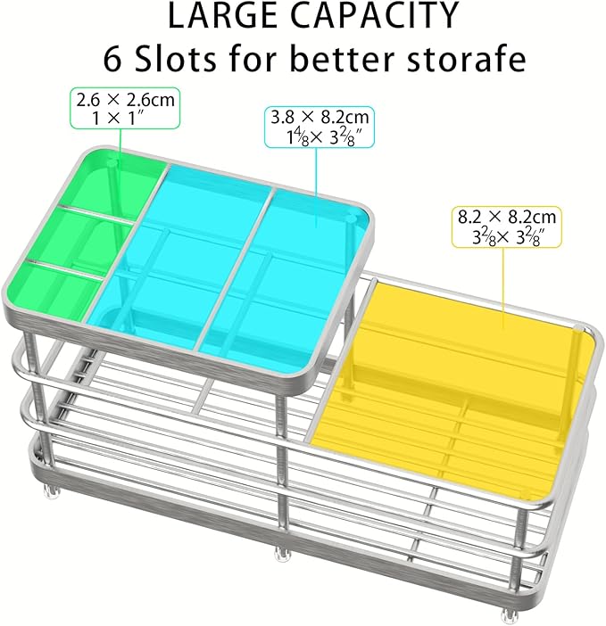 - UPGRADED 6 SLOTS DESIGN - 2024 NEW DESIGN upgraded size, 3 Regular Toothbrush Slot Size: 1.0*1.0inch; 2 Large Slots size: 1.5*3.25inch, which is suitable for Toothpaste, Electric Toothbrush, facial cleanser, electric shaver, comb, eyebrow trimmer and so on. In addition, the WHALCHI bathroom organizer also designed with an extra large Slot, the size is 3.25*3.25inch, fits in hand soap, shaving foam, mouthwash, etc. Large Capactiy can meet most kind of bathroom stuffs.