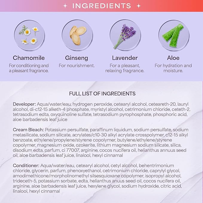 - Packed With Good: This powerful but nourishing cream bleach is designed to lift hair color up to 8 levels using a purple base to cancel yellow, brassy tones. The products in this kit are developed with hair-friendly ingredients like Chamomile, Lavender, Ginseng, and Aloe.
