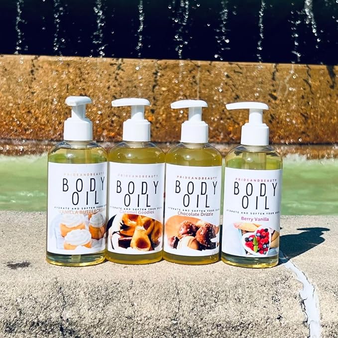 PrideandBeauty After Shower Oil. Skin Hydrating Oil. Body Oil Scented. Body Oils For Women Dry Skin. (Vanilla Buttercream) (8 OUNCES, Amber Vanilla Blossom)