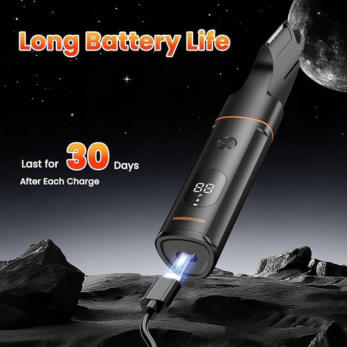 - 【Long-lasting Battery with LED Display】MAXGROOM pubic hair trimmer for men is powered by a large-capacity Lithium-ion battery, providing 90 minutes of cordless use after a full charge. The intelligent LED display shows real-time battery status and reminds you when it’s time to recharge, ensuring you’re never caught off guard.