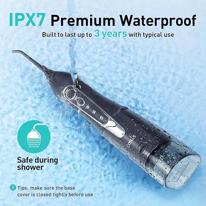 - Water Flossing Cleans Effectively for a Healthier Mouth: The COSLUS water flosser boasts advanced, safe, and effective 0.3mm+0.3mm ultra-fine dual-thread water pulse technology, developed and continually optimized by our research team over years of research and real user testing. This water dental pick delivers 1400-1800 high-pressure pulses per minute to target and dislodge plaque for a thorough clean. This water flosser also features multiple operation modes and multiple pressure settings to suit different oral conditions and users