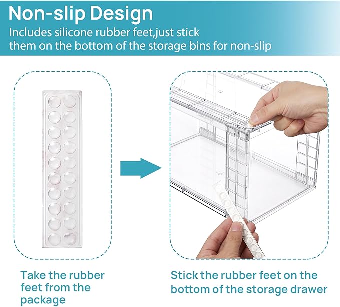 - Built-in Handle and Non-Slip--- Clear organizing containers are designed with pull-out handles, it is convenient to store and take out items.Extra silicone pads are included, add the rubber sticker dots to the bottom,our storage drawers slides in and out very effortlessly and outer frame don't move when pulled out the drawers