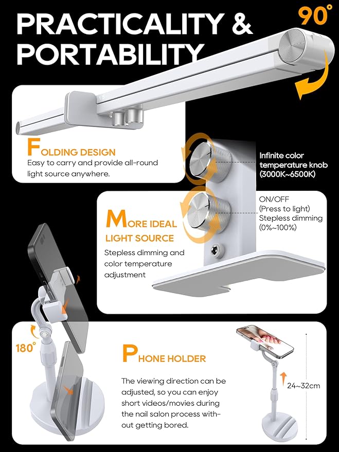 Portable Desk Lamp for Nail Tech, 3 Color Temperature, 4000-6000K Brightness Adjustable LED Nail Light for Desk