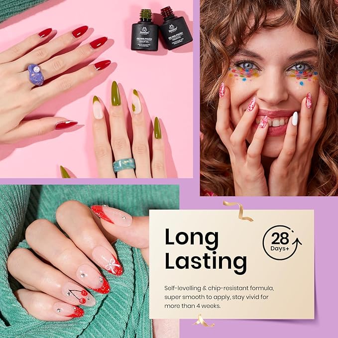 - Long-lasting Shine and Durability: Unlike regular nail polish, our UV/LED Soak off Gel Nail polish cures quickly under a nail lamp and lasts up to 28 days with the proper application. Your nails will stay shiny and chip-free for weeks with little upkeep. Reminder: Cure under a lamp for 60-120 seconds.