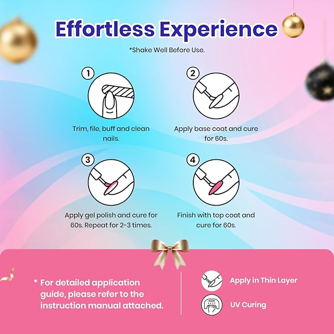 - Speed Curing with LED Nail Lamp: The nail gel polish Beauty Gift Sets need to be cured under LED Dryer Lamp. Average for LED Lamp 60-120 secs. Kindly note: After openning valid for 12 months.This item is UV gel. It is still sticky after curing. It must be used with a base and top coat!