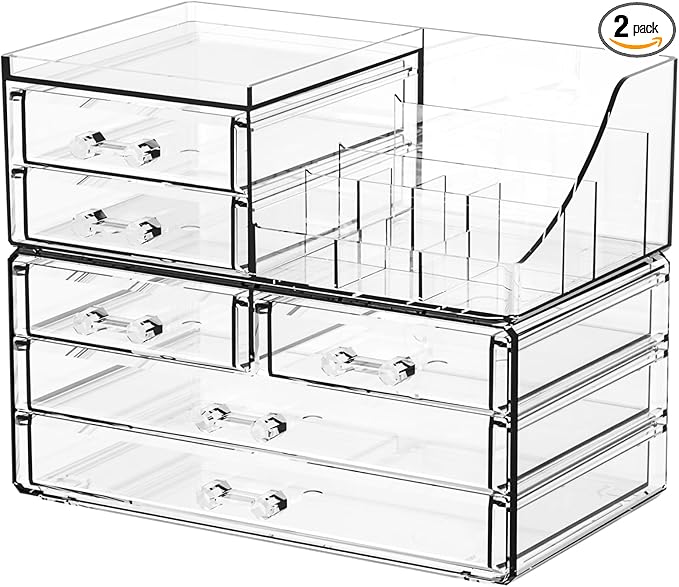 - 【Cute Acrylic Makeup Organizers 】Size:9.3‘'L x 5.2"W x 7.3"H,Composed of 2 Pack independent drawer organizers, there are a total of 6 drawers that can be stacked on top of each other or used separately, to fit any bathroom, dresser, vanity or Bathroom Counter Organizer and Storage