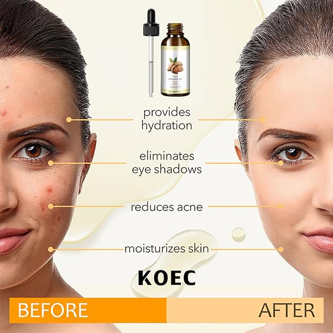 - [Cold Pressed Almond Oil]: The light texture of organic almond oil is easy to be absorbed by the skin, smooth and non-greasy, and the essential oil is extracted by cold pressing, thus retaining the nutrition of almonds, suitable for various skin types