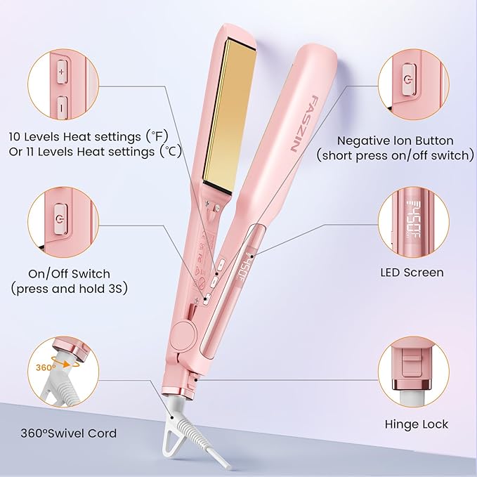 Faszin Professional Hair Straightener, 1.65inch Wide-Plate, Titanium Negative Ion Flat Iron, 30s Rapid Heating, LED Temp Display, Wide Voltage & 10 Adjustable Temp Levels (260-450℉) - Pink