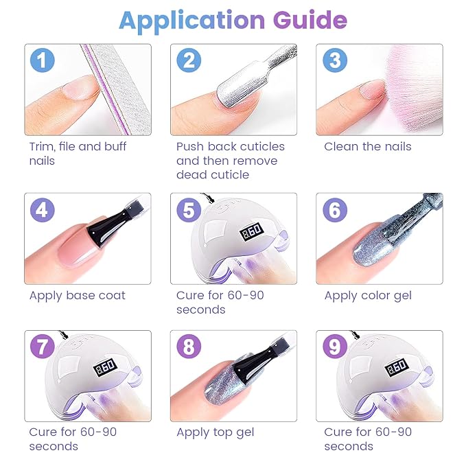- HOME SALON QUALITY:Galaxy gel nail polish is a good choice for a nail salon or nail starter at home. You can design your own manicure at home to show your style. Remember the gel polish needs to be cured under LED or UV nail lamp. The average for Nail Lamp 60 -120 secs