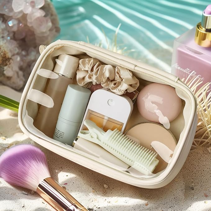 - PREMIUM QUALITY:This elegant clear makeup bag is crafted from high-quality PU leather with durability.The natural texture not only feels luxurious but also adds a touch of sophistication to your travel ensemble.