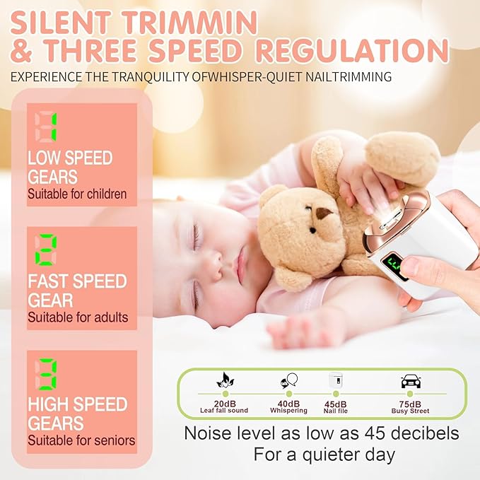 - 【Simple One-Button Controls】 -Baby Nail Trimmer Electric is designed with ease of use in mind. The controls are elegantly integrated into the sleek body, featuring a single button that activates both the nail trimmer . This intuitive design means that there's no need to fumble with multiple buttons or switches, making it accessible and straightforward for users of all ages, including children and the elderly.