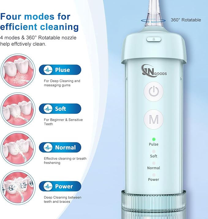 - 4. 4 Clean Modes: JNGOODS cordless oral flossers teeth cleaner has Normal, Soft, Pulse and Power modes for choosing with Low-noise below 60db, which can meet various oral needs.