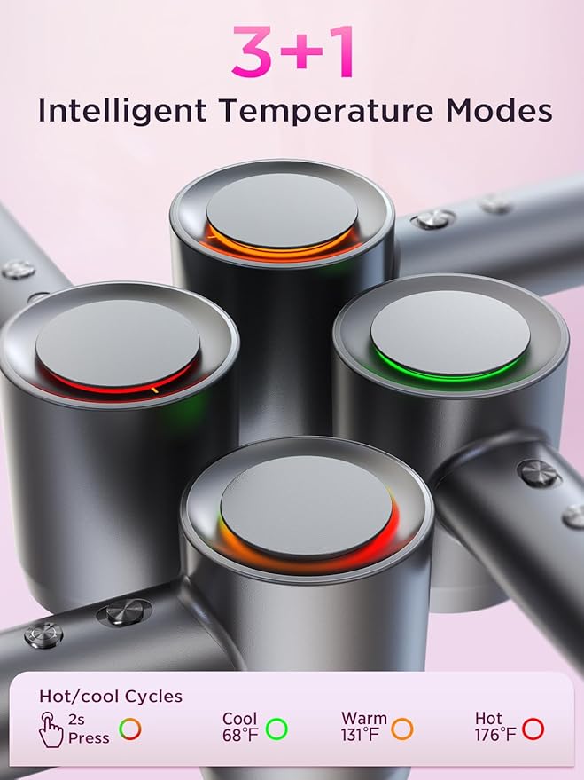 - [Smart Temperature Control] Our hair dryer features an innovative LED ring design that showcases different modes: Red for hot air, Orange for warm air, and Green for cool air. Long-press for alternating hot, warm, and cool air, ideal for all hair types including curly, thick, and fine hair. Additionally, it includes an NTC intelligent temperature control sensor that accurately adjusts the temperature 110 times per second, ensuring a constant temperature to protect your hair from heat damage.