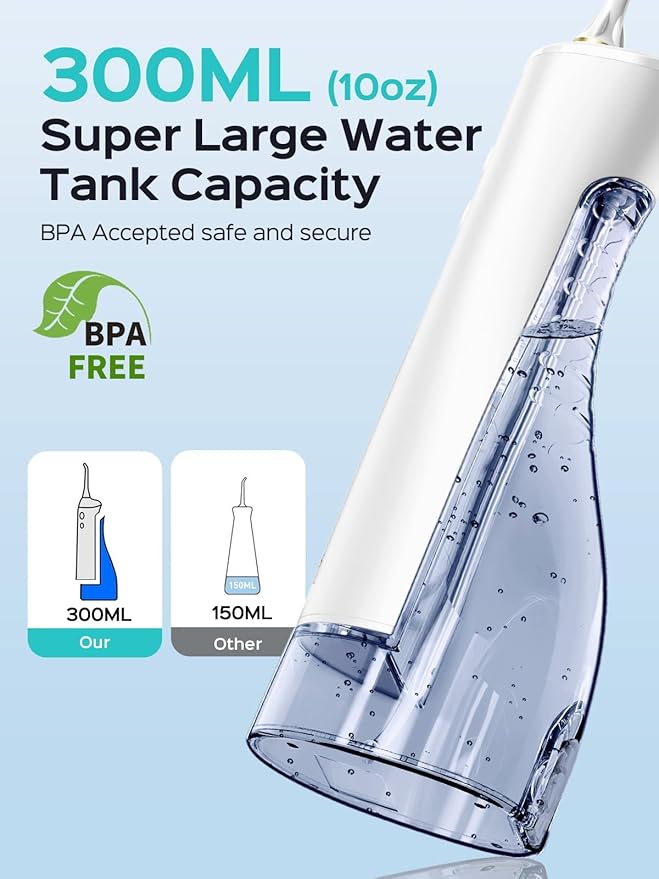 - Customizable Nozzle System: Comes with a variety of functional nozzles—including standard, orthodontic, and periodontal tips—to meet the needs of different users. Whether you wear braces, have sensitive gums, or seek deep cleaning, you’ll enjoy a targeted and comfortable oral care experience. Equipped with a 300ML large-capacity water tank, which allows for longer use without frequent refilling, making it more suitable for thorough, full-mouth cleaning and an efficient flossing experience. Supports multi-user sharing, making it especially ideal for family use and daily oral care routines
