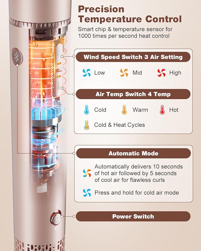 - COMFORT AND SAFETY - Featuring ergonomically designed buttons, the blow dryer weighs only 1 pound, allowing for easy one-handed operation and mode switching. The 360° rotating power cord ensures convenient use. Equipped with an NTC feedback system, a bimetallic thermal switch, and a non-resettable fuse, air styler also includes an ALCI safety plug with overheating protection and electric shock prevention.