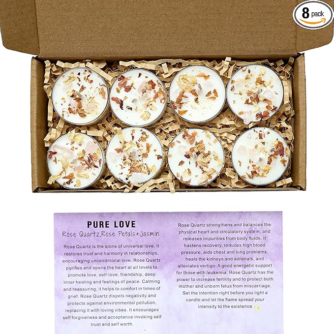 - Tea Lights 8pc Candle Set: rose + quartz + jasmine petals. Rose Quartz purifies and opens the heart on all levels, promoting love, self-love, friendship, deep inner healing and a sense of peace. Also makes a great gift for candle lovers!