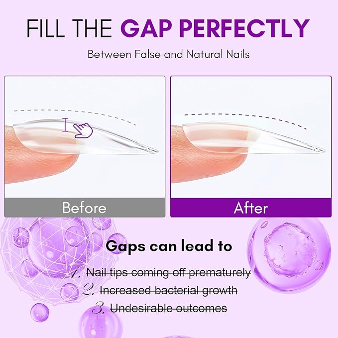 - Mess-Free Application: The solid nail gel, non-flowing texture allows for easy one-handed operation, eliminating the need to press down on the nail tip with your other hand. It also fills gaps between natural nails and fake tips for a stronger, natural-looking bond. Plus, it won’t stick to your hands, making cleanup a breeze