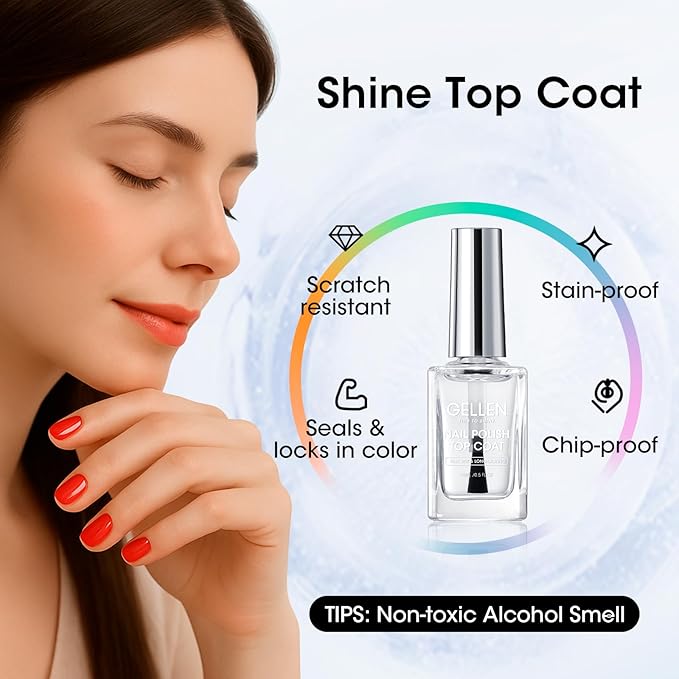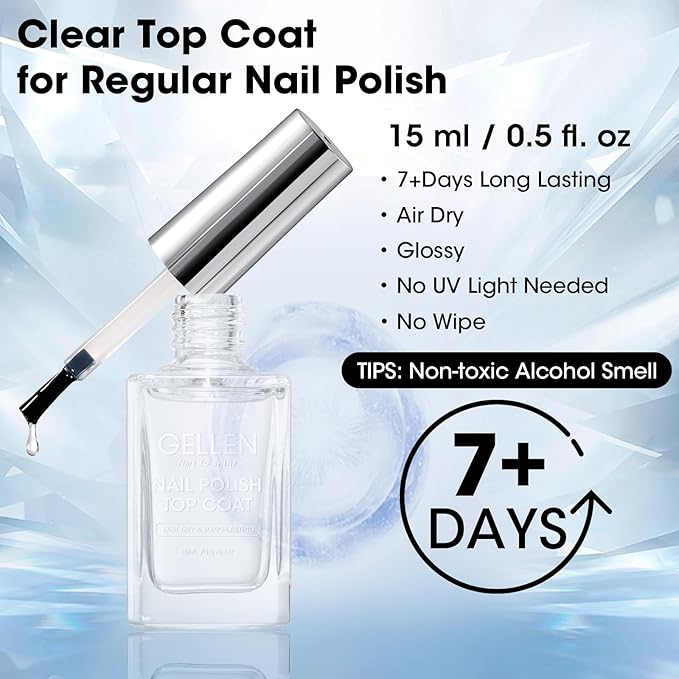 GELLEN Clear Nail Polish Top Coat, Shine Glossy Regular Nail Polish, Calcium Formula Strengthens Nails, Quick Air Dry, No Wipe, Long Lasting, Chip Resistant, Not UV Gel, Hema Free, Non-toxic, 15ml