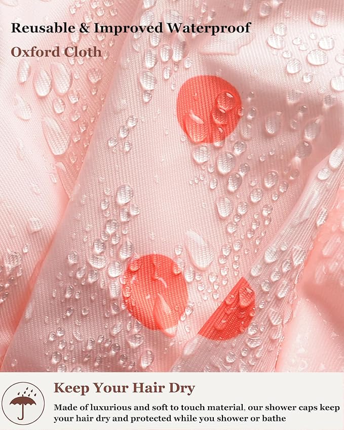 - ☔Keep Your Hair Dry: This shower cap protects your hair well. It is made of upgraded Oxford cloth and waterproof material. And this reusable waterproof shower cap for women fits snugly around your head and ensures your hair is dry.