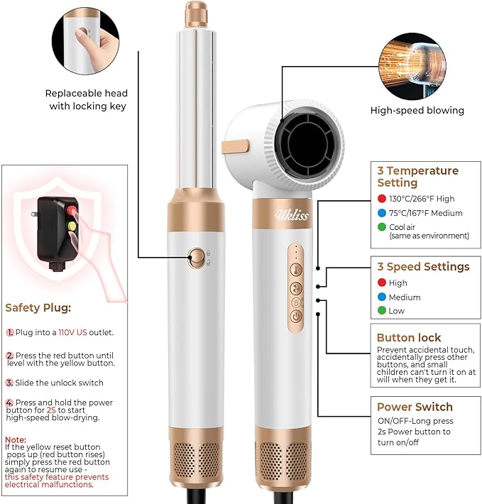- Certified Safe and User-Friendly Design: Your safety is our priority. The UKLISS hair dryer brush is equipped with an ALCI safety plug, certified by American safety standards. The press-and-hold power button and lock feature ensure accidental starts are prevented. Enjoy peace of mind while styling, knowing this hot air brush offers advanced electrical safety protection for you and your family.