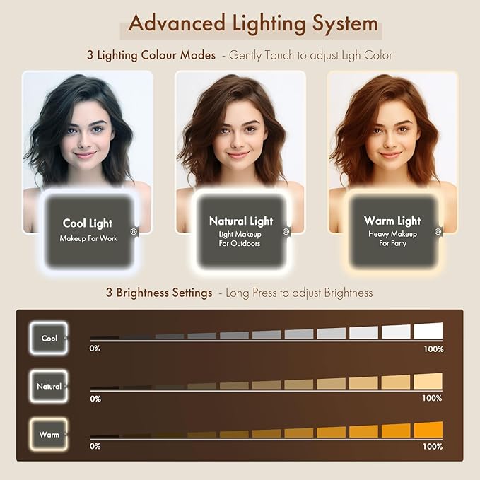 - Removable & Adjustable Brightness & 3 Colors Lighting Modes: This makeup travel bag features a large detachable tri-light, dimmable LED makeup mirror with 3 lighting color settings, from evening light to bright sun, allowing you to adjust makeup for where you are going.