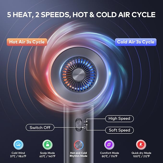 - Hair Dryer with Diffuser Cold Air Setting: Hair Dryer Have 5 heat settings and 2 air speed settings. One-touch hot/cold cycle mode. Equipped with heat indicator and memory function. lonic Hair Dryer with Diffuser dries quickly and