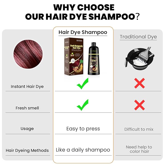 - [100% Coverage Hair] Our dark burgundy hair dye shampoo can effectively cover gray hair, dye vibrant hair color, make your hair look healthier, combine color, conditioning and cleansing your hair, gentle to hair and scalp,multi-tasking