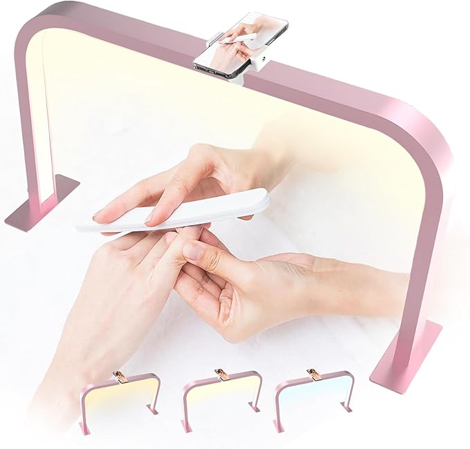 Half Moon Nail Desk Lamp, 45W LED Nail Tech Desk Light with Phone Holder, Half Moon Nail Light 3000-6000K Adjustable Brightness, Nail Table Arch Lamp, for Manicure Lash Eyelas (Pink), YY111