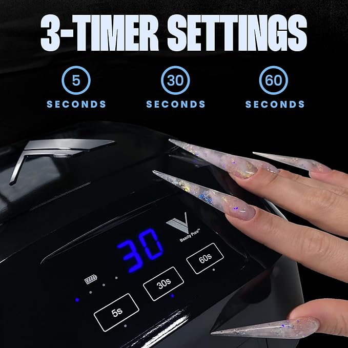 - 3-Timer Settings: Easily do quick touch-ups or full-service nail treatments with 3-timer settings: 5 seconds, 30 seconds, and 60 seconds.