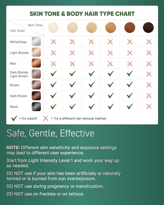 - 【6 Adjustable Energy Levels】 Customize your treatment with 6 energy levels to match your skin sensitivity and hair type. Begin at a low level and gradually increase for optimal results.