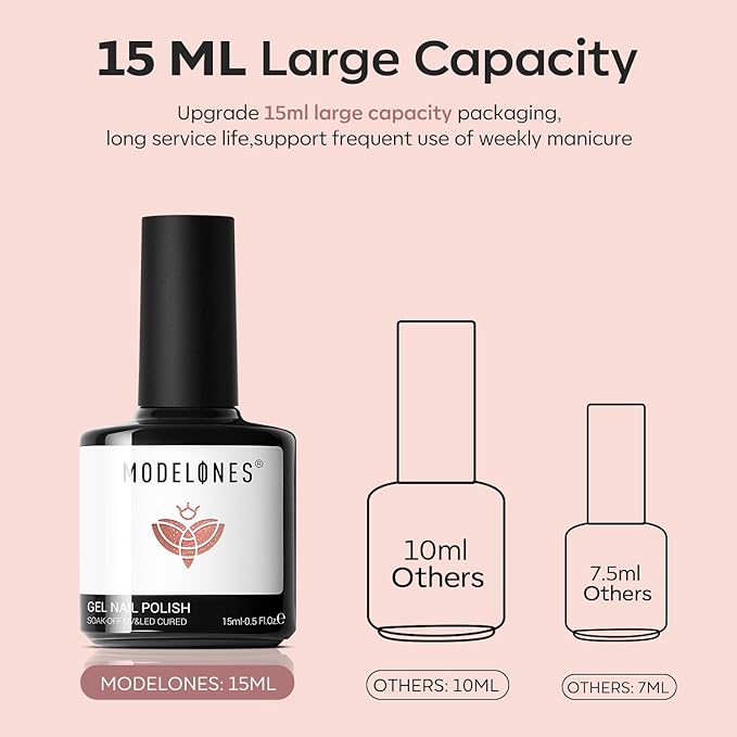 - 28 Days No Peel-off & Bubble Free: Modelones Gel Polish is made of professional formula, which is adjusted after 72 tests. Say Goodbye to Air-bubble and Peel-off problems. Our exclusive easy-glide brush for quick, easy, even, professional application on nails. Spend 3 minutes and long-lasting for 28+ days with unrivaled shininess under the proper application