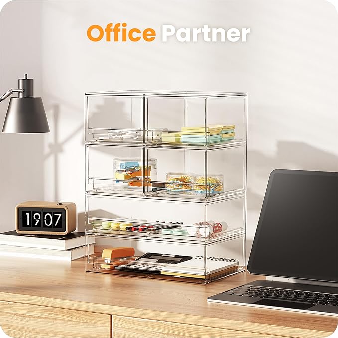 - ใClear Accessใโ The clear acrylic drawers allow you to instantly see whatโs inside, making it easy to find items.In the office, store pens, scissors, chargers, and USB drives to keep your desk neat.For makeup, these acrylic makeup organizers are perfect for holding lipsticks, brushes, nail polish, cotton pads, and skincare products.In the bedroom, organize jewelry, glasses, watches, and earphones in these clear organizer drawers.