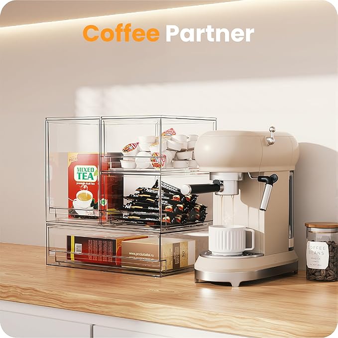 - ใGrab & Go with Easeใโ These drawers feature a built-in handle, making it easy to access your items, even in tight spaces.In kitchen cabinets, use these organizer bins to organize sauces, snacks, spices, coffee, honey, cookies, and candies.Under the sink, they are perfect for storing sponges, brushes, trash bags.In the refrigerator, use them for cheese slices, eggs, jam, and fruit. These clear storage bins help keep your kitchen neat.