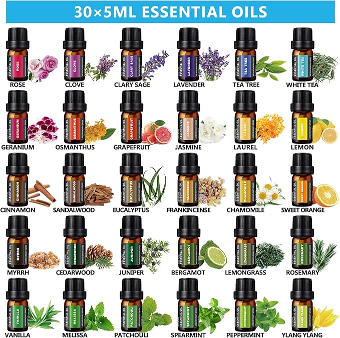 - ❤30 Essential Plant Oils❤ TOP 30 natural essential oils. The dark bottle will help keep the oils fresh and also guard against light degradation. No harsh ingredients, No additives, NO fillers. We value safety, quality in offering the high quality aroma oil products.