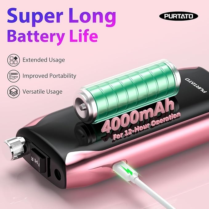 - 【Extra Long Battery Life & Low Noise】Equipped with a 4000mAh battery, this electric nail file machine can be used continuously for 12 hours, providing an efficient experience for both home users and professional manicurists. To minimize discomfort during use, the cordless nail E file with low-noise design that ensures peaceful environment while enjoying your manicure and reduces heat generation. For nail salons, greatly improve work efficiency.