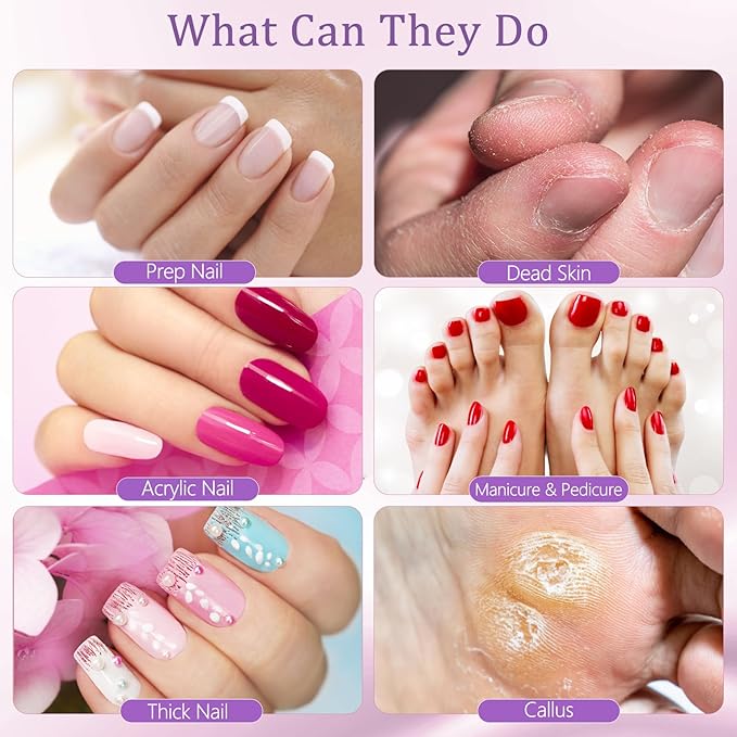 - Low-Noise Motor & Salon-Quality Results: The nail filer upgraded motor maintains low heat, noise, and vibration. Anti-clog design protects natural nails, delivering professional outcomes at home. Drill nails for filing, shaping, buffing, and polishing both fingernails and toenails.