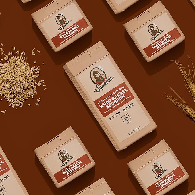 Dr. Squatch NEW Body Wash for Men with Nourishing, Natural Ingredients | No Paraben, Phthalate, Sulfate | Wood Barrel Bourbon (14 oz), Coconut Castaway & Pine Tar (8 oz, 2-Pack) & Body Scrubber