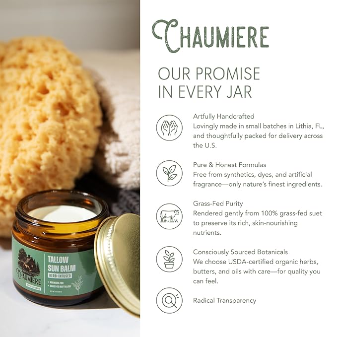 - GRASS-FED TALLOW BASE – Rich in vitamins A, D, E & K, our grass-fed beef tallow closely mimics the skin’s natural oils to deeply nourish without clogging pores.