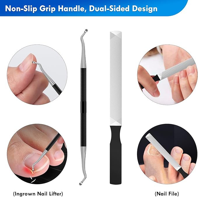 - [Ergonomic Design]: Ingrown toenail removal kit, the innovative bionic angled head is ergonomically designed to make toenail trimming easy, reducing the need for uncomfortable bending. Perfect for pregnant women, seniors, and those with back pain. Additionally, the anti-splash design prevents nail clippings from flying into your eyes.