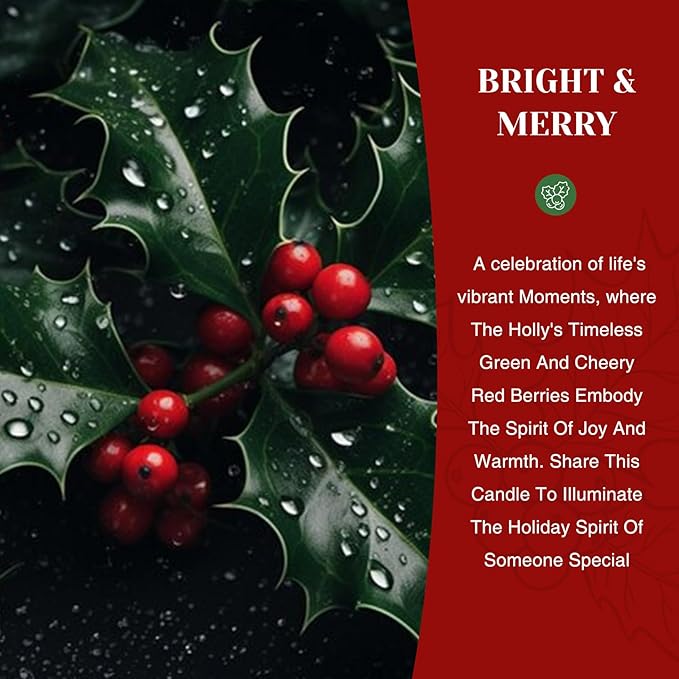 - 【Bright & Merry】:a celebration of life's vibrant moments, where the holly's timeless green and cheery red berries embody the spirit of joy and warmth. Share this candle to illuminate the holiday spirit of someone special
