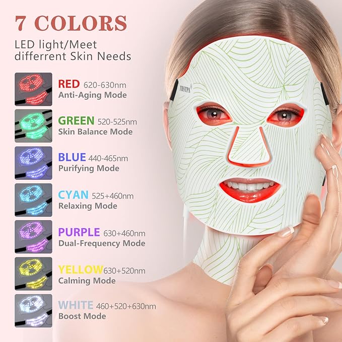 - 【7 colors Led Face Mask】Red light therapy mask is equipped with UV-free LED bulbs that emit 7 light energy colors,Each color of light shows beneficial effects on particular skin conditions,Led face mask light therapy benefits include enhanced collagen production,reduced wrinkles,improved skin tone and brightness,Different colors for different skin problems,choose the corresponding light according to the needs of the skin,Each color light has 5 gears for obtain better Specific effect,7 colors pure narrow-wavelength light sources for more effective skincare,led mask light therapy