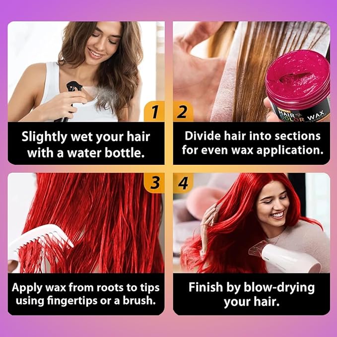 - Explore Fashionable Hair Color Wax Shades : Unleash your creativity with vibrant hair color for women—Green, Orange, Claret, Purple, Red, and Blue.Simply choose a shade and apply for a bold look that washes out easily