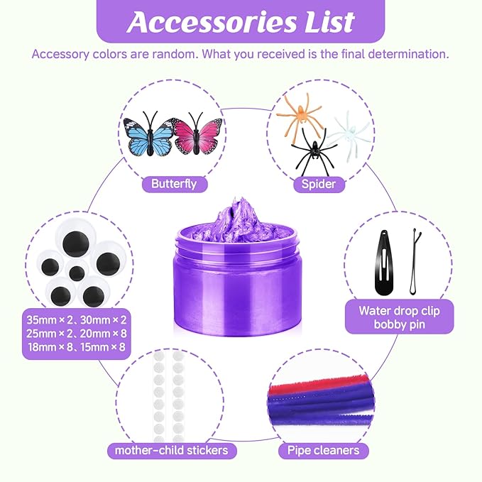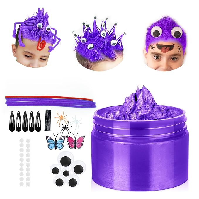- 【Crazy Hair Kit Package】 Including a hair color wax, 2 butterflies, 3 spiders,5 water drop clips,8 bobby pins,5 pipe cleaners,27 mother-child stickers,and 38 eyes of different sizes.You can use these accessories to create any crazy hairstyle you want.