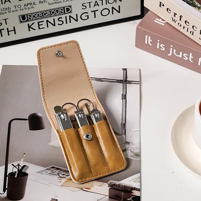 Premium Stainless Steel Nail Clippers Set - Travel Grooming Kit, 6pc Manicure/Pedicure Tools with PU Case - Unisex Gift for Men and Women(D-Khaki)