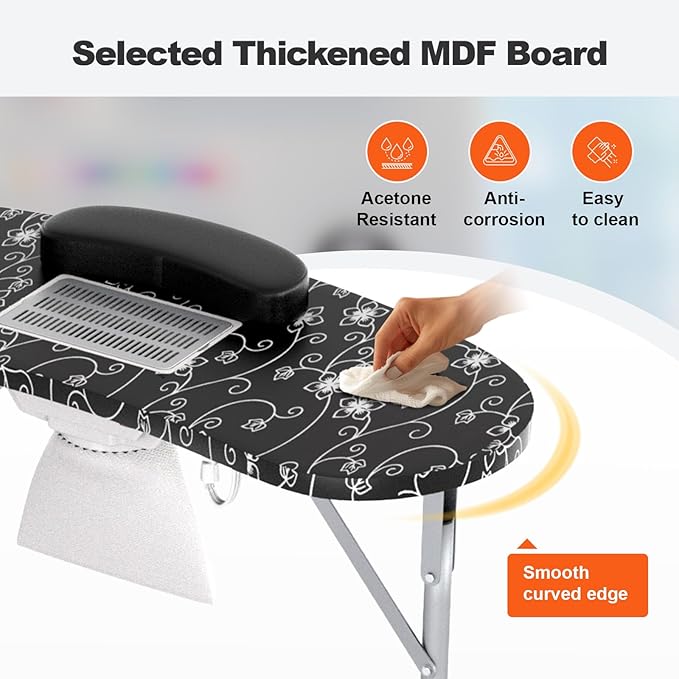 - Elegant Appearance: White/Black smooth tabletop with floral pattern improves the taste of design, the surface which adopts high hardness spraying process is glossy and rust-proof. Suitable for a variety of uses, serving as a portable choice for traveling manicurists, a temporary workstation for nail salons, and a convenient solution for doing nails at home