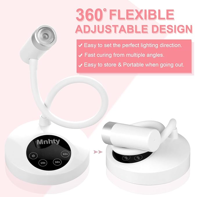 - Goose Neck U V Nail Lamp: The goose neck u v nail lamp features a long goose neck design that allows for 360° free bending and rotation. The gooseneck flash cure lamp for gel x nails can be flexibly adjusted in height and direction, allowing to set the lighting direction and accurately focus the light, no harm to hands. The 12W U V led dual light source gel lamp can uniformly and quickly cure gel nails from multiple angles, shorten curing time, cure more stably than other nail lamps.